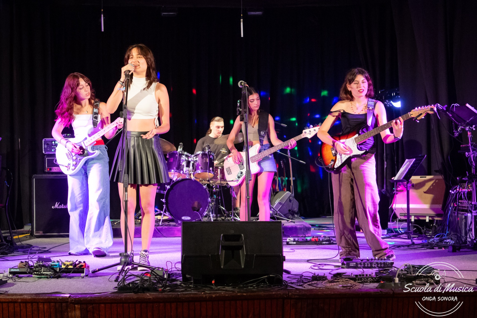 Alla Scuola di Musica Onda Sonora il saggio finale non è la classica esibizione "uno alla volta". Tutti gli studenti hanno la possibilità di salire sul palco e suonare insieme in band, vivendo l'esperienza di un vero concerto dal vivo. È un momento di condivisione, energia e musica suonata insieme, dove ogni allievo può esprimersi e sentire l'emozione del palco.